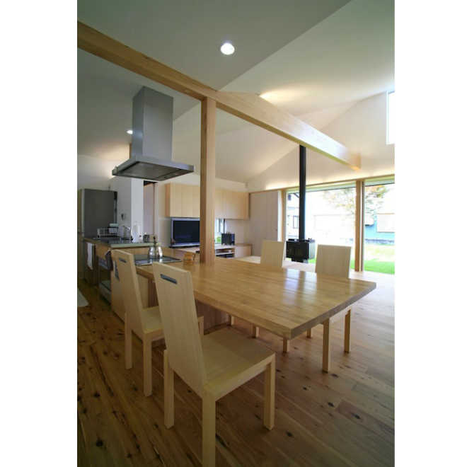 内部空間は、木材や漆喰など素材の色を活かした色調とし、できるだけディテイルを出さないシンプルな空間とした。居間や寝室、子供室などそれぞれの室内空間の形状は、そのボリュームのもつ屋根形状をそのまま室内に反映する形で決定し、外部形状と室内形状を一致させている。